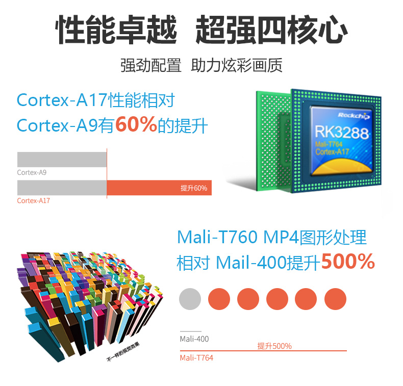 CPU 瑞芯微RK3128,四核ARM Cortex-A7,1.2GHz主频