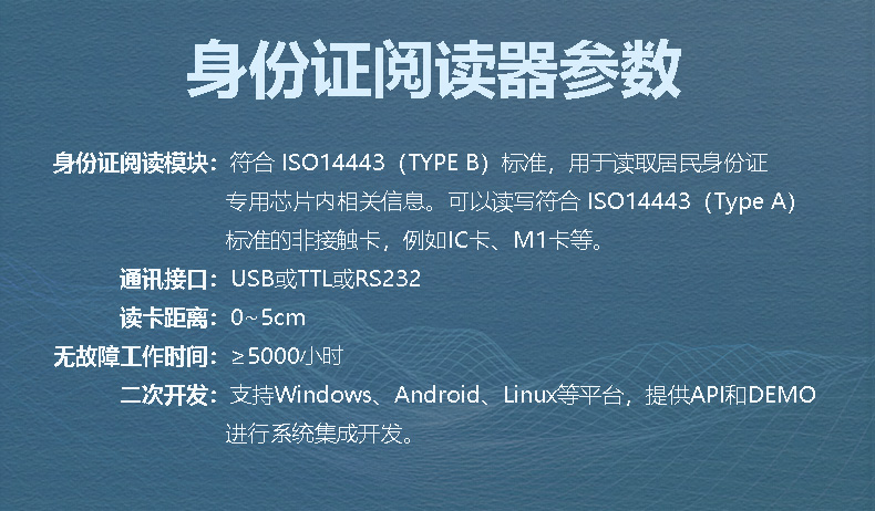 身份证阅读 身份证阅读模块:符合 ISO14443(TYPE B)标准,用于读取居民身份证专用芯片内相关信息。