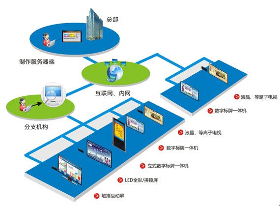 多媒体信息发布系统,结合我们提供的液晶显示设备,为客户提供基于网络/WIFI/4G和互动技术的整体信息发布解决方案。多媒体信息发布系统是基于互联网服务的电子信息管理及发布的各场景设计,在设备内嵌入智能媒体播放APP,在中心管理服务器,实现了素材的存储,发布内容的制作,终端的管理,使用户随时随地登录系统平台,通过PC和移动端进行远程管理和节目制作与发布。用户通过多媒体形式传播丰富的信息,用于电子海报、商业广告、促销活动等,实现多媒体信息管理的跨区域整合与覆盖。